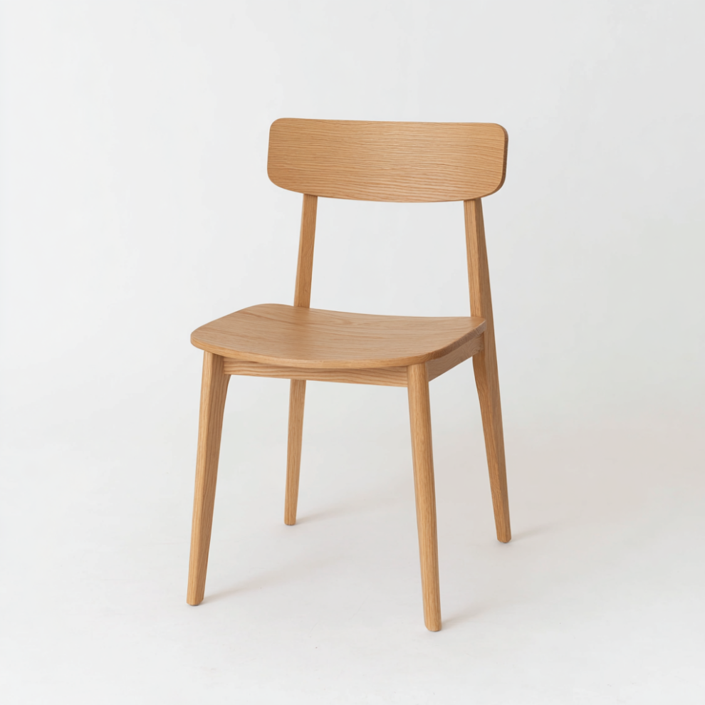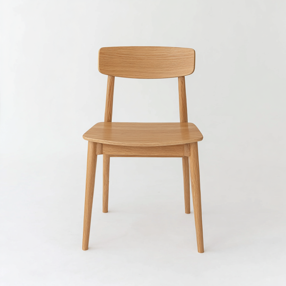 Стул выполнен на прочном дубовом каркасе и отличается лаконичным силуэтом. Удобства ему придают широкая наклонная спинка и глубокое сиденье. Округлые элементы и выразительная древесная фактура создают уютный образ, а матовое лаковое покрытие подчёркивает текстуру и защищает стул.